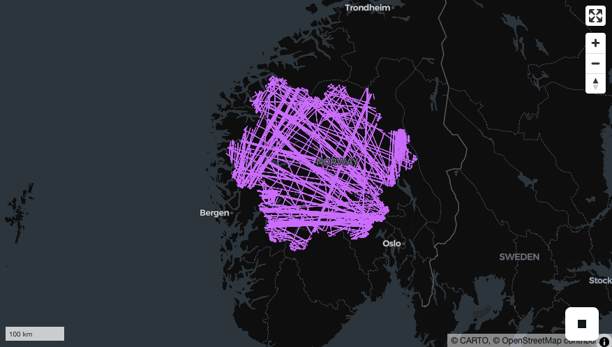 Ved å velge en H3-sektor med oppløsning 2 midt i Sør-Norge, kan vi hente ut all flytrafikk i dette området for datoen vår, 11. juli 2025.